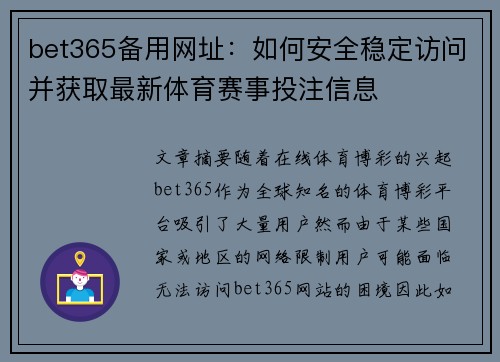 随着在线体育博彩的兴起,bet365作为全球知名的体育博彩平台,吸引了大量用户。然而,由于某些国家或地区的网络限制,用户可能面临无法访问bet365网站的困境。因此,如何安全稳定地访问bet365并获取最新的体育赛事投注信息成为了许多玩家关注的问题。本文将从四个方面详细阐述如何安全稳定地访问bet365:首先是如何选择合适的访问工具;其次是如何保证账号安全;第三部分将讨论如何获得实时的赛事数据;最后,介绍如何避开常见的网络问题并确保稳定的连接。通过这些内容,用户将能更好地享受体育赛事投注的乐趣,确保其访问过程既安全又顺畅。